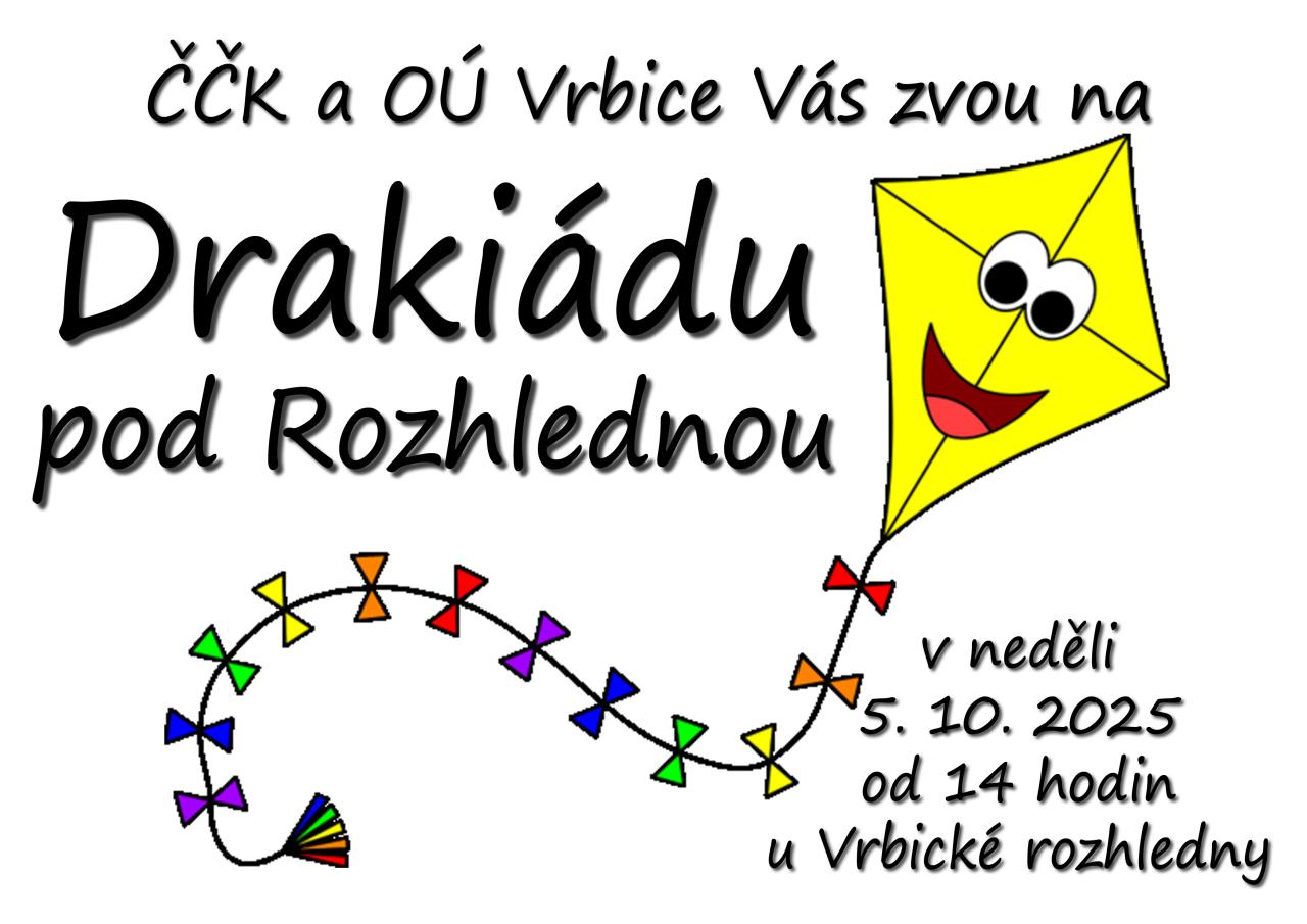 Český červený kříž a Obecní úřad Vrbice srdečně zvou na Drakiádu, která se koná u Vrbické rozhledny. Přijďte si užít odpoledne plné zábavy s možností pouštění draků. Akce začíná v neděli 5. října 2025 od 14 hodin. Nezapomeňte si přinést své draky a dobrou náladu.