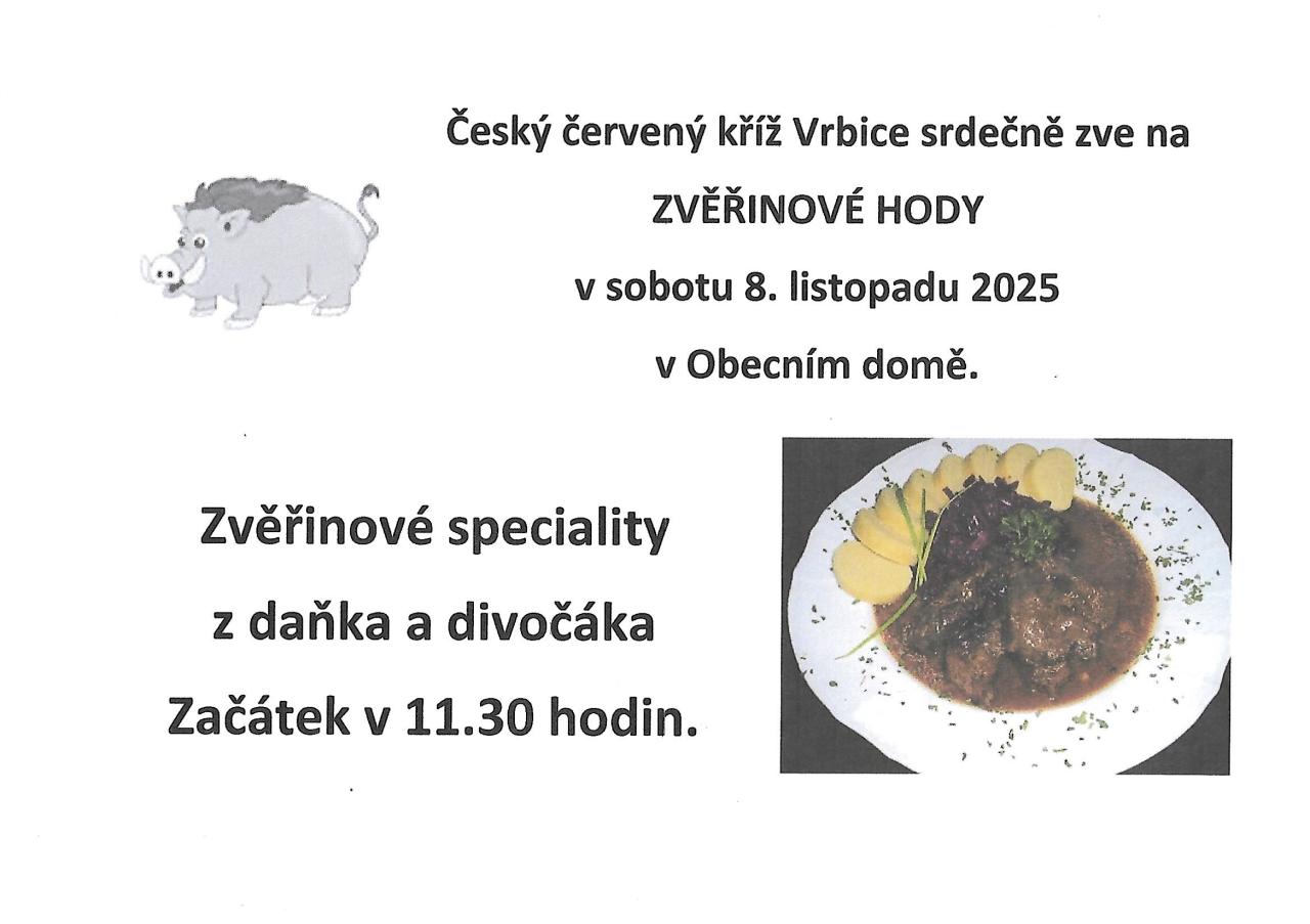 Český červený kříž Vrbice vás srdečně zve na Zvěřinové hody, které se konají v sobotu 8. listopadu 2025. Tato akce se uskuteční na Vrbici v obecním sále, kde si můžete vychutnat speciality z daňka a divočáka. Čeká vás bohatý výběr zvěřinových pokrmů, které potěší všechny milovníky dobrého jídla. Těšíme se na vaši účast.